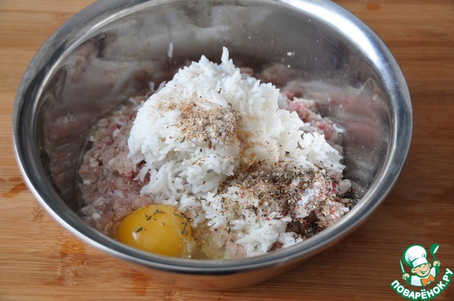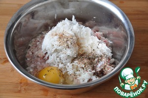 Берём фарш (у меня свиной), добавляем из пакетика рис, яйцо, оставшуюся приправу Тако. Всё хорошо вымешиваем.