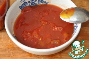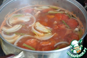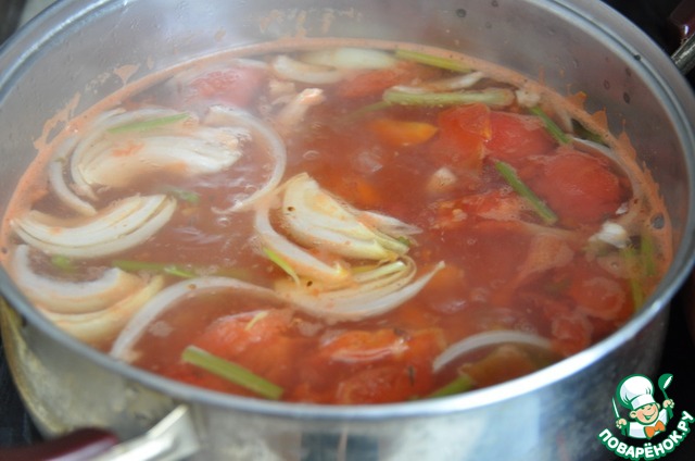 В суп переливаем томаты, кладём нарезанный перьями лук и мелко рубленный чеснок. Доводим до кипения.