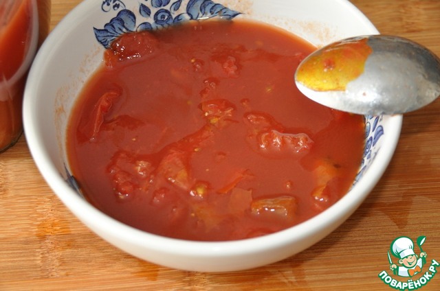 Берём томаты в собственном соку, разминаем.