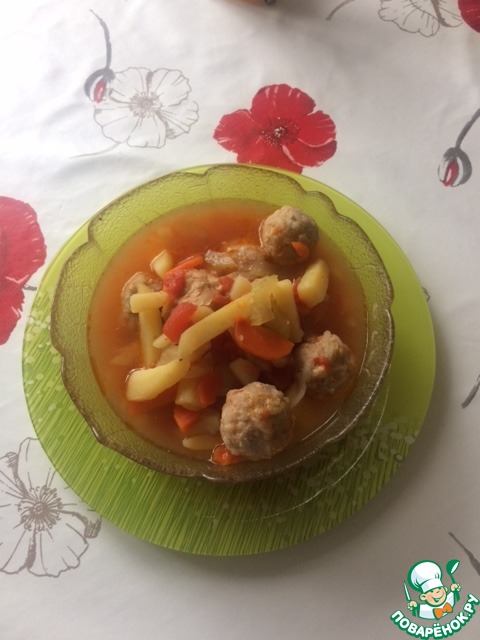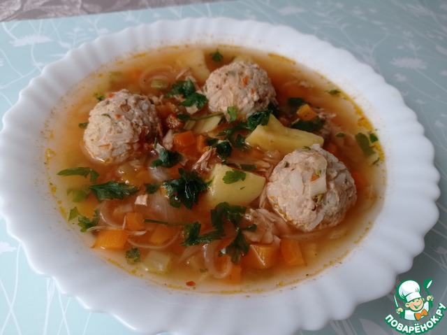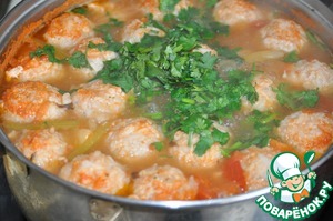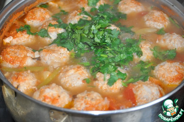 Кладём в суп фрикадельки, доводим до кипения, варим до готовности 20 минут на среднем огне. Добавляем нарубленную кинзу, отключаем.