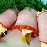 Выкладываем полученную массу на буженину. Сверху кладем нарезанные полосочками огурцы (свежие, соленые).