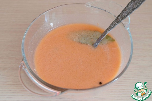 В миске соединить томатную пасту (1 ст. ложка), сметану (1 ст. ложка), смесь душистых перцев (8 шт.), растительное масло (3 ст. ложки), муку (1 ч. ложка с горкой), соль и черный молотый перец добавить по вкусу, добавить лавровый лист.
