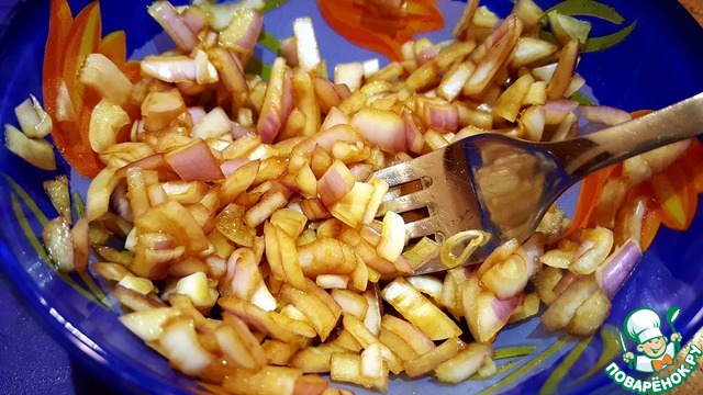 Нарезать лук мелким кубиком, поместить в салатник, залить соевым соусом и хорошенько размешать вилкой.