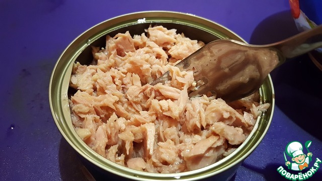 Слить с тунца лишнее масло и размять тунец вилкой.