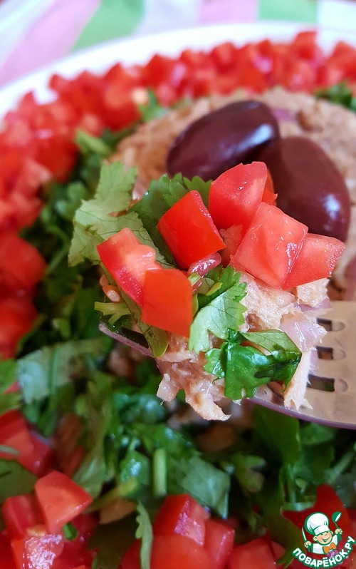 Я использовала для салата кинзу, так же, как в оригинальном рецепте, но Вы можете взять пучок любой любимой зелени, сочетающейся по вкусу с тунцом. Лук у меня красный, но по сути, в этом салате подойдёт любой лук.