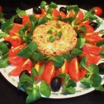 Большой ложкой выкладываем на тарелку кольцом помидоры. Украшаем при желании маслинкой. Салат готов! Подавать незамедлительно. Приятного аппетита!
