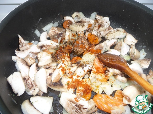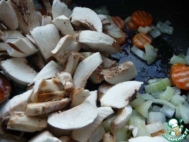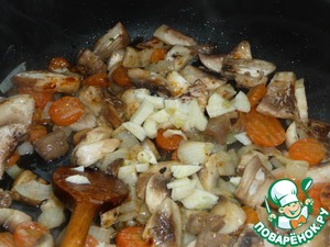 Грибы очистить от пленки, нарезать произвольно не большими кусочками. Добавить к луку с морковью, продолжая обжаривать.