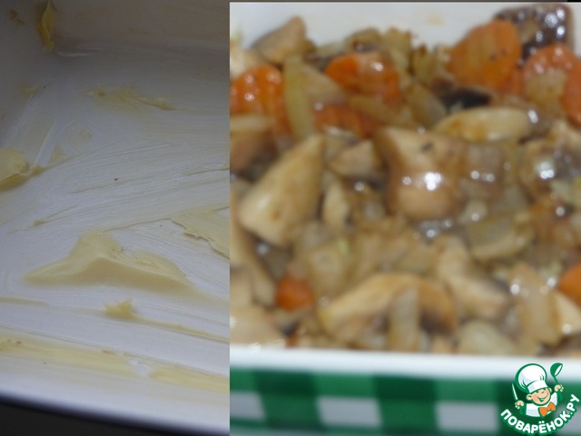 Форму смазать маслом, выложить в нее обжареные грибы. (извиняюсь за мутное фото, грибы парили..)