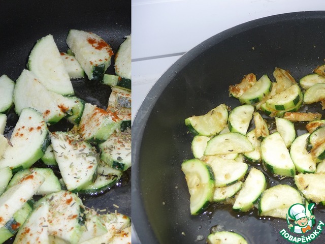 Цуккини обжарить в хорошо разогретом растительном масле, добавив специи, соль, перец, до румяной корочки.