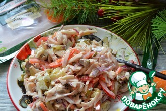 Три года назад мы отмечали Новый Год в Питере, в уютном семейном кафе. Этот салат на праздничном столе был не только самым красивым, но и самым вкусным. И поскольку хозяйка заведения была знакомой одного из наших друзей, мне не составило труда разузнать рецепт. С тех пор я готовлю его не только на Новый Год, но и на другие праздники. Он неизменно пользуется огромной популярностью. Знаю, что многие хозяйки уже начали подыскивать рецепты для новогоднего меню. Заходите, я уверена - это именно то, что вам нужно!