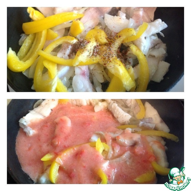 Далее всыпать к рыбке соль, специи, чеснок пропущенный через пресс. Болгарский перец нарезать соломкой и тоже добавить к рыбке. Огонь уменьшить и обжарить все вместе еще пару минут.