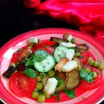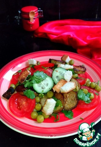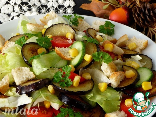 Предлагаю вкусный, питательный и необычный салат с баклажанами, сладкой кукурузой и чесночными сухариками. Готовиться быстро, из простых и доступных продуктов. Такой салат порадует вашу семью и друзей. Готовьте с удовольствием. Рецепт встретился на просторах инета, автору огромное спасибо.