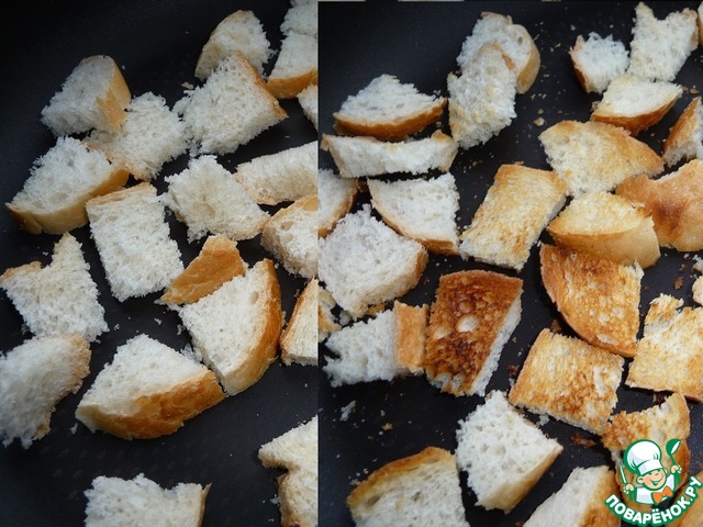 Взять пшеничный хлеб или батон, булочку не сладкую нарезать его на кубики. Сухарики обжарить на сухой сковороде до румяности.