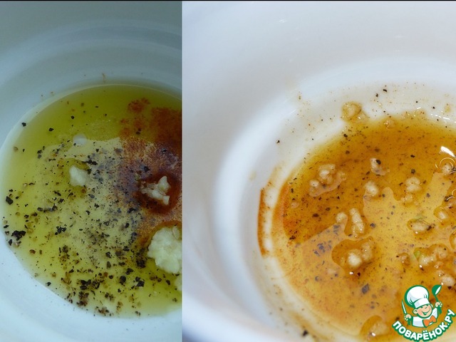 Готовим соус для сухариков. В чашечку налить оливковое масло, соль, перец черный, перец красный. Выдавить чеснок через пресс. Перемешать.