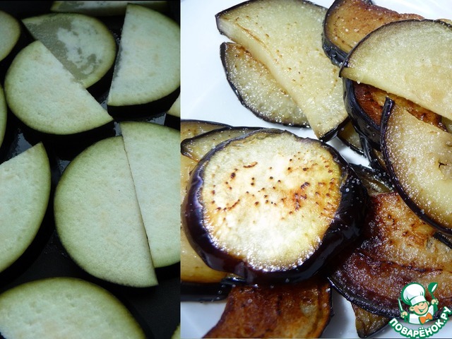 Баклажан порезать полукольцами. Обжарить на растительном масле с обеих сторон до готовности, на небольшом огне. Слегка остудить.