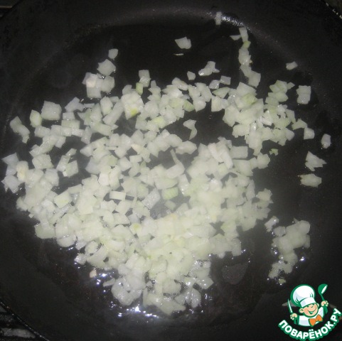 Лук нарезаем мелкими кубиками, обжариваем на небольшом количестве растительного масла до золотистого цвета.
