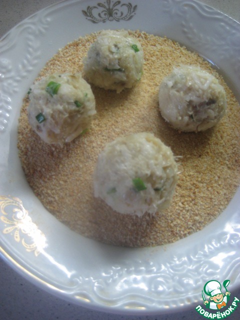 Формируем небольшие шарики, обваливаем их в панировочных сухарях.