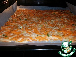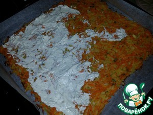 Смесь из овощей и яиц выкладываем на бумагу для выпечки, формируя прямоугольник. Это будет наша основа для рулета. Ставим в разогретую до 180 градусов духовку на 30 минут.