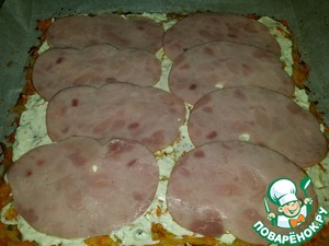 На соус выкладываем тонко нарезанные ломтики ветчины. При желании можно брать любое любимое мясо, вкусно будет и с окороком, и с бужениной, только нужно, чтоб тонко нарезано было, иначе сложно будет свернуть рулет.