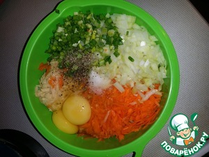 Картофель и морковь натереть на крупной терке, лук нарезать мелкими кубиками (в оригинальном рецепте был лук шалот и нарезался довольно-таки крупными ломтиками. На мой вкус лучше мелко и обычный репчатый), зеленый лук так же мелко нарезать. Добавить 3 яйца, соль и перец. Все перемешать.