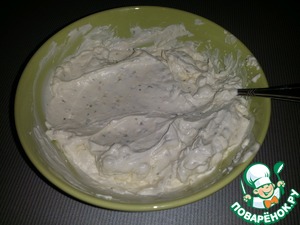 Пока готовится основа, займемся приготовлением соуса. Смешать сливочный сыр с зеленью (я брала 2 баночки "Хохланд" с зеленью) и ложкой майонеза. Майонез я добавляю исключительно для того, чтоб соус был не такой густой и удобно было намазать на овощной основу. Можно заменить натуральным йогуртом или сметаной.