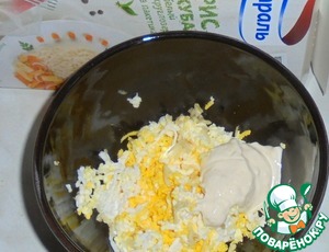 Яйца отвариваем и измельчаем на мелкой терке. Добавляем тертый чеснок и сметану, перемешиваем.