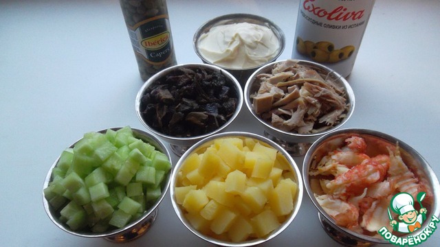 Очистим раковые шейки, обдерем мясо с перепелок, порвем и порежем его произвольно, картошку очистим и порежем мелким кубиком, грибы – так же, яйца очистим. Огурец порежем мелким кубиком. Данные операции, думаю, известны всем кулинарам, поэтому не буду выставлять фото этих процессов. Это не очень интересно.