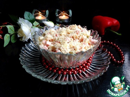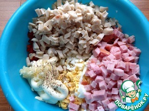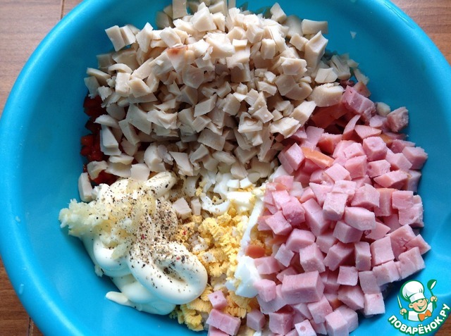 Добавить майонез, смесь молотых перцев и чеснок, пропущенный через пресс. Мелкими кубиками нарезать ветчину и кальмары. Салат перемешать. При подаче сверху украсить сыром, натертым на мелкой терке.