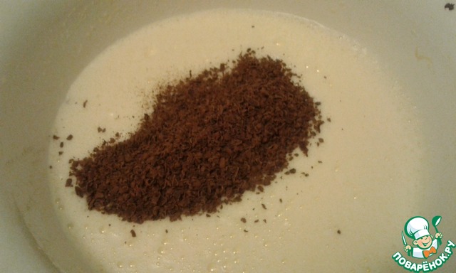 Натертый на терке шоколад добавляем в смесь, тут же добавляем соду гашеную уксусом перемешать