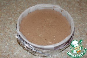 Дно и бока разъемной формы выстилаем пергаментом. Снаружи оборачиваем фольгой. Выкладываем тесто в форму объемом 20 см. Ставим ее в противень, наполняем его кипятком до половины высоты формы. Выпекаем 50-60 минут при 160 градусах.