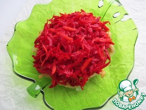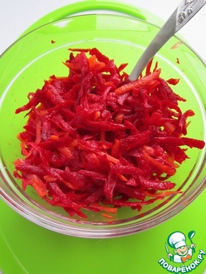 Первым делом подготовим овощную "шубу". Нашинкуем 150 г сырой свеклы на крупной тёрке, добавим к ней три столовые ложки натёртой сырой моркови. Прибавим 3 ст. ложки уксуса, 1 чайную ложку сахара и хорошую щепотку соли. Перемешаем всю эту красоту и отставим в сторону.