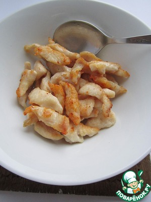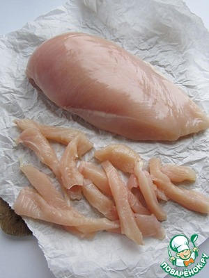 Куриное филе нарежем поперёк волокон, как на отбивные, а затем на полоски, не очень тонко. Кусочки филе посолим, запанируем в муке и быстро обжарим порциями в один слой, на хорошо разогретой сковороде в четырёх столовых ложках растительного масла до появления лёгкого румянца, всё время перемешивая филе. Не пересушите!
