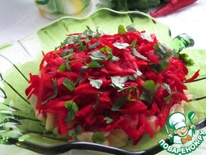 Пришло время для овощной "шубы". Попробуем овощи на вкус, если нужно, добавим соль, сахар, или уксус. Салат не должен быть пресным, в нём должны хорошо чувствоваться и сладость, и кислинка, и острота. Распределяем равномерно "шубу" поверх куриного филе слоем, толщиной полтора-два сантиметра. Сверху обязательно украсим салат измельчённой зеленью кинзы.