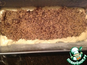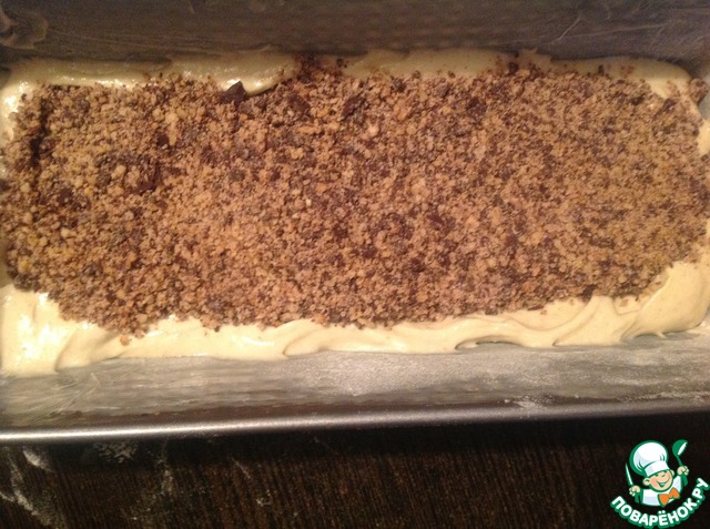 Посыпать половиной шоколадно-ореховой смеси, выложить ещё треть теста, посыпать орехами. Затем выложить оставшееся тесто. Выпекать 1час 5 минут. Готовый кекс остудить.