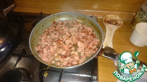 На эту сковородку кладем мясную нарезку, перчим (я из мельницы 5 перцев, немного соли). Масла не добавляю, т. к. есть жирок в колбасках, если суховато - немного добавляем.