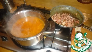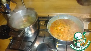 Бульон варится, овощи - тушатся. Не забываем снимать пену и помешивать овощи.