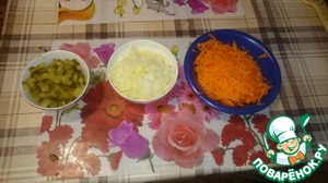 Лук - полукольцами, морковь натираем на крупной терке, огурцы - вдоль на 4 части, потом на маленькие куски поперек.