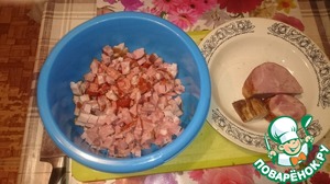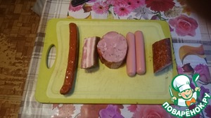Каждый раз я покупаю разные составляющие, в зависимости от того, что есть в магазине. Но всегда ищу копченые колбаски (охотничьи), копченую куриную грудку, а дальше - по вкусу.