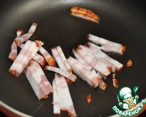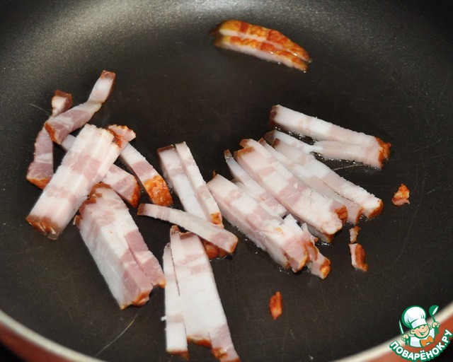 Берём грудинку (или бекон) варено-копчёную или сыро-копчёную, режем тонкими полосками и обжариваем (вытапливаем жир) на сковороде.