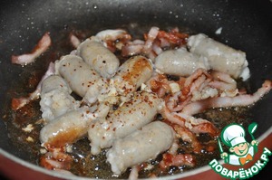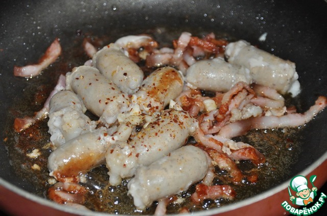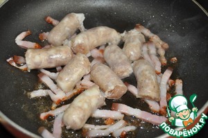 2. Если мы вначале выжарим грудинку, то при обжаривании колбасок рискуем ее просто сжечь. Здесь нужно быть максимально осторожным. Я бы положил колбаски тогда, когда сало на грудинке станет полупрозрачным. Кстати, на фотографии видно, что Вы поступили именно так. Не стали вытапливать жир полностью.