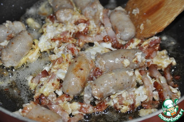 Берём сырые колбаски, можно брать ветчину, варёное мясо или ассорти из мясных продуктов, режем кусочками. Кладём к выжаренной грудинке.