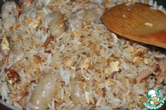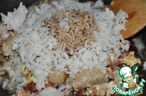 Всё перемешиваем, разбивая комочки риса, отключаем огонь.