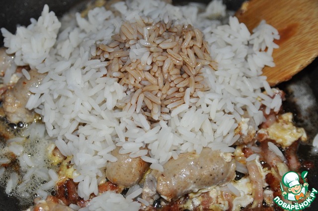 Добавляем рис из пакетиков, поливаем соевым соусом.
