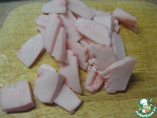 Разогреваем сковороду, выкладываем на нее кусочки сала и обжариваем до золотистой корочки (не пережарить!) -
