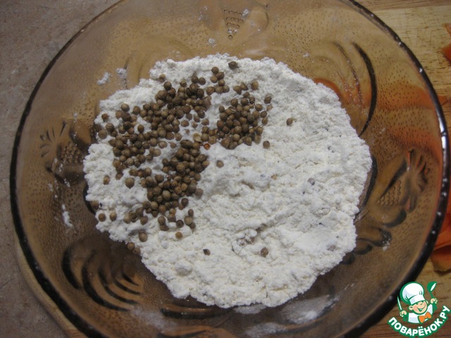 В миске смешать муку, семена горчицы, кориандра, посолить, поперчить, - наша панировка готова