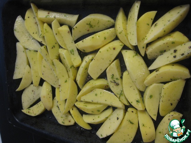 Картофель почистить, нарезать дольками, в миске смешать картошку, масло и специи (вы можете использовать любые по своему желанию)