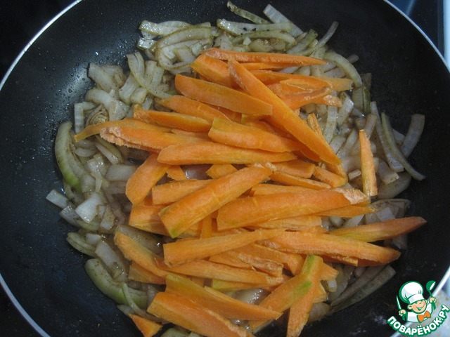 Лук нарезать четверть кольцами, морковь соломкой (даже этакой лентой узкой)
