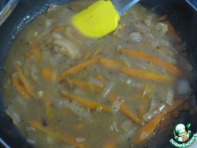 Затем лопаткой отодвигаем на половину сковороды лук и морковь, и высыпаем остатки нашей панировки, чтобы получить соус (если панировка не осталась, просто добавьте муку и специи)