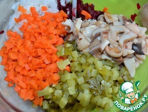 Таким же размером нарезать морковь, лук и маринованные огурцы. Выложить к свекле.