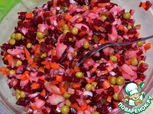 Свеклу очистить и нарезать мелким кубиком. Нарезка в винегрете по правилам : не крупнее самого мелкого целого ингредиента. В моем случае все нарезается размером ( +- ) зеленого горошка. Свеклу выложить в миску, посолить слегка и заправить душистым подсолнечным маслом, перемешать.
